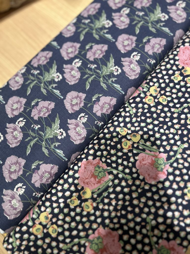 今回ご紹介させていただくのは「コットン100%リバティの新柄の生地」でございます。落ち着いた色味の中にリバティらしい繊細な花柄が映え、すこし肉厚の肌触りの良いビオラ地となっております。